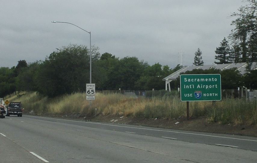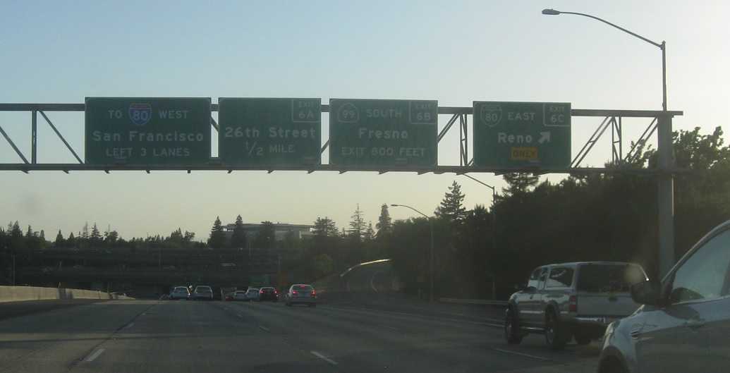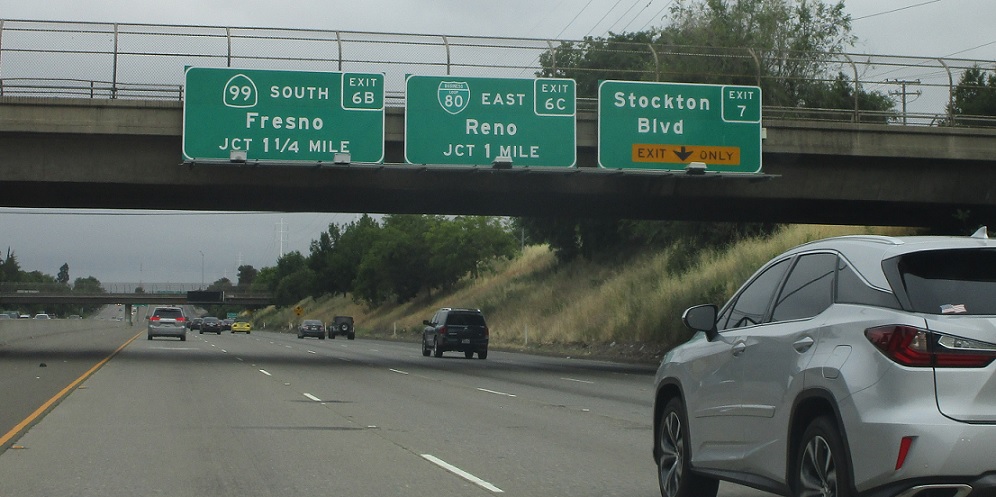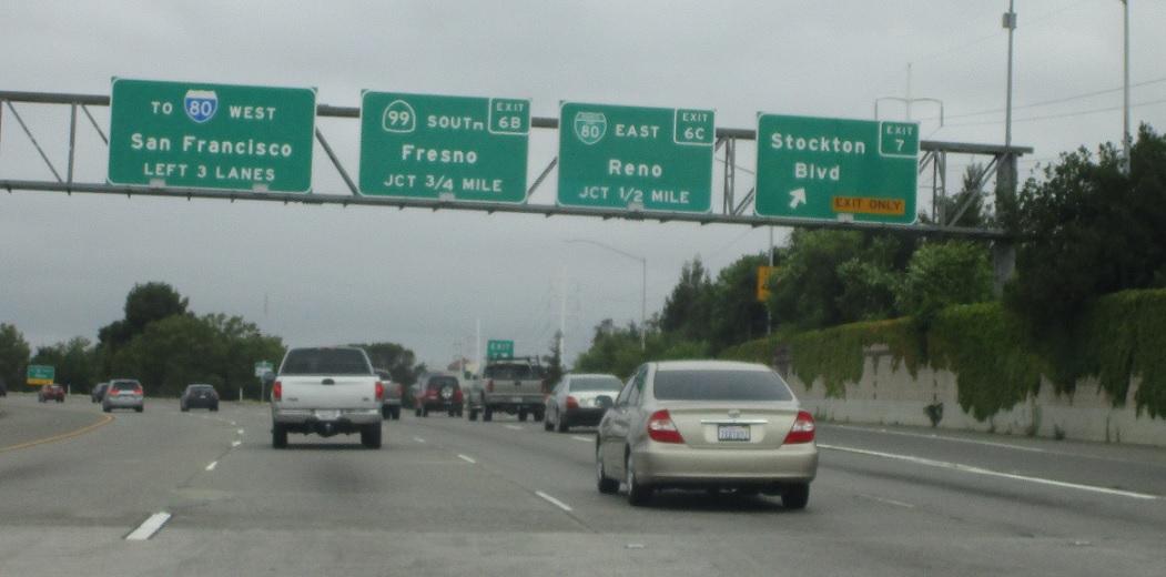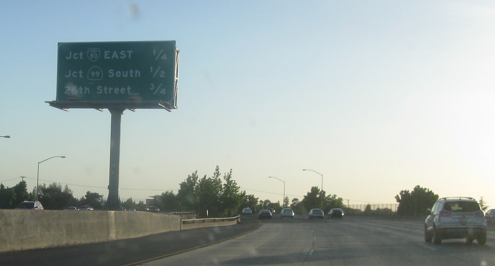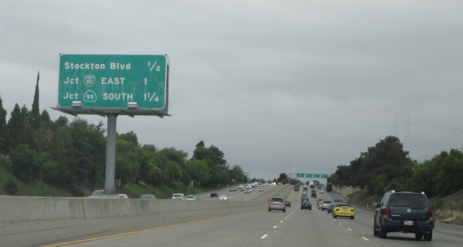Exit for I-80 Business east and unsigned SR 51 east. Exit just beyond that for SR 99 south. SR 99 north and I-80 Business west join U.S. 50 as the three routes merge onto unsigned Interstate 305 west.
