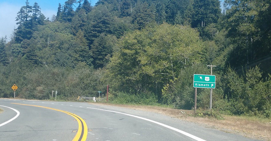 Three miles later, we’ll approach US 101. Keep right for Klamath.