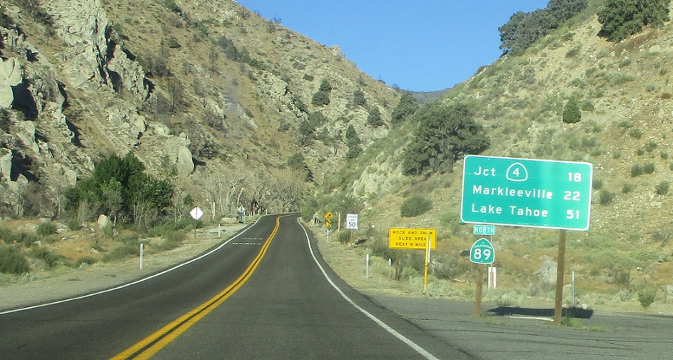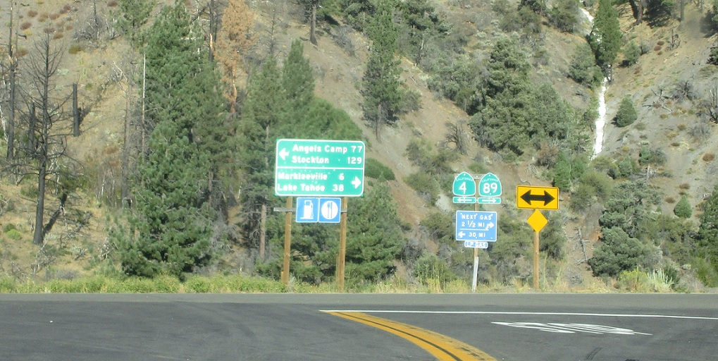 A few miles later we’ll approach SR 4. Turn left for 4 west, which takes a windy, scenic routing over to Stockton. Turn right for 89 north to Markleeville and onto Tahoe.