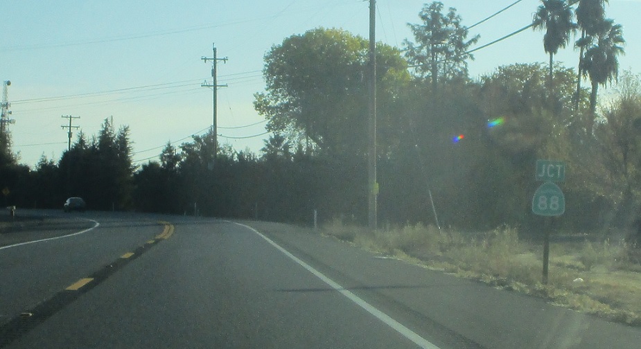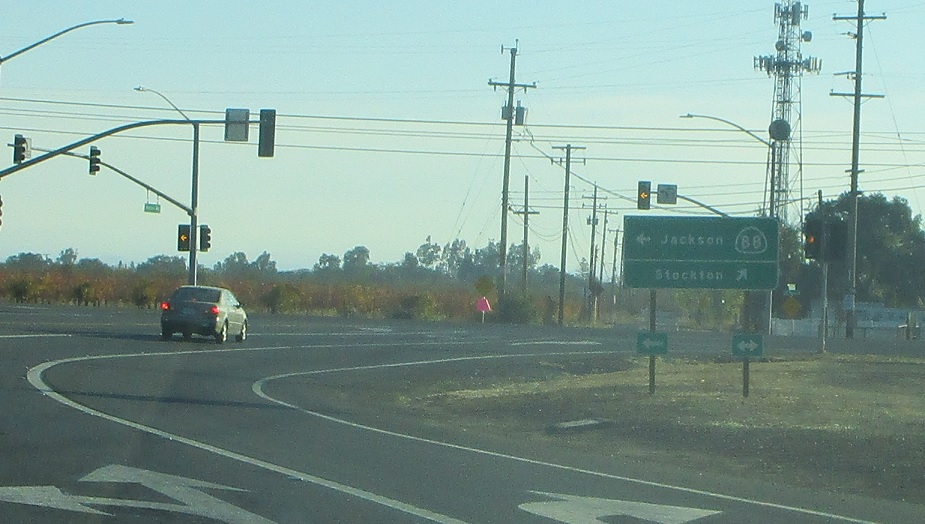Turn left for 12/88 east to Jackson. Turn right for 88 west to Stockton. Not sure why the shields are missing.