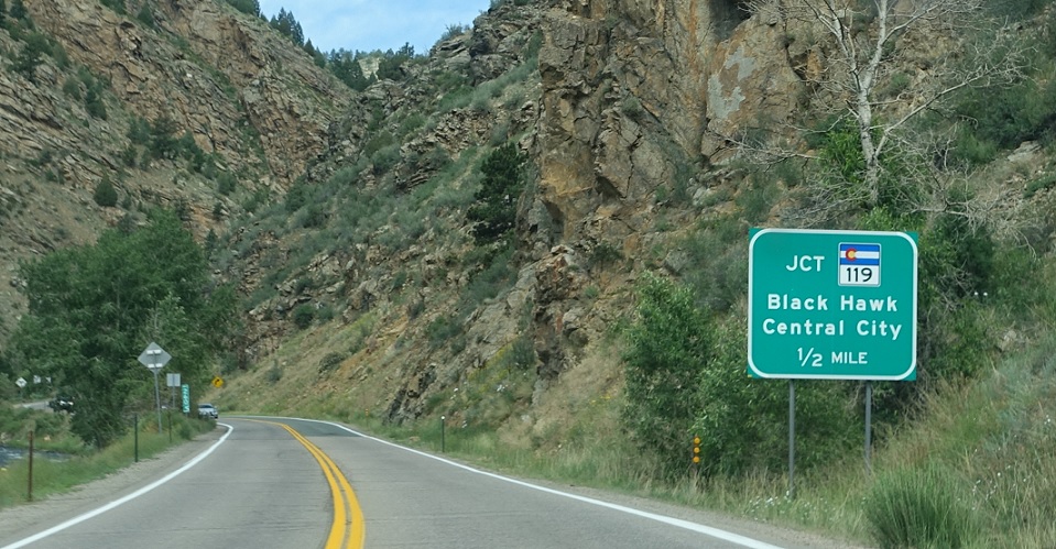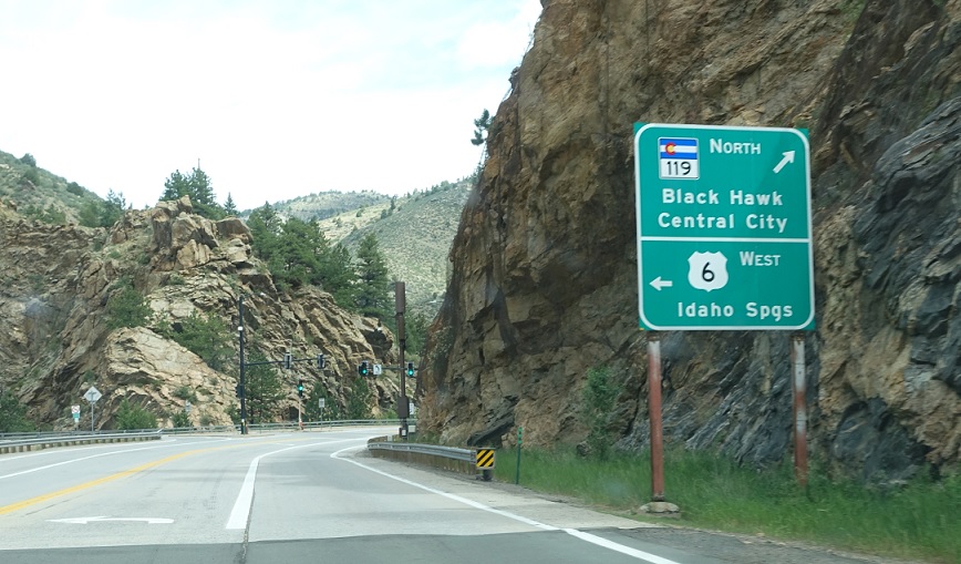 Turn left to stay on US-6 towards Idaho Springs and immediately enter Clear Creek Cty. Stay straight for SH-119, a long route that heads north towards the Black Hawk/Central City tourist areas, up to Nederland, down to Boulder, and over to Longmont via a vary diverse driving experience.