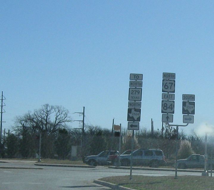 Turn left for SH 279 and FM 2524 north (the TO is erroneous), right for FM 2524 south, and stay straight for 67/84
