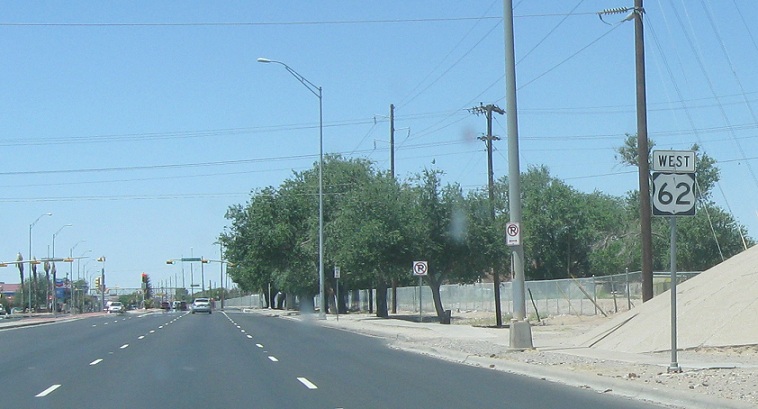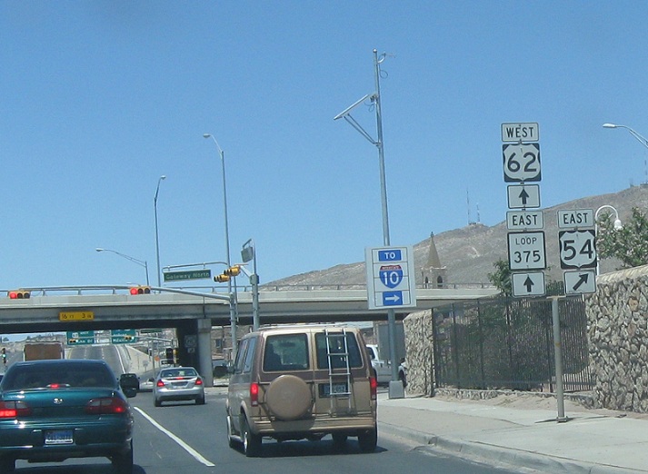 This area gets a bit confusing. Turn right for 54 east. Stay straight for 62 west. Stay straigt and turn left at the light, which is unmarked at the light to get to Loop 375 east. The ramp goes straight from 62 west to 375 east, so for all intents and purposes, this is the western terminus of US-54