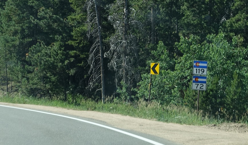 Reassurance shield as 72 joins 119 and we head out of Nederland. SH-119 is the primary route here, so gets top billing and the mileposts.