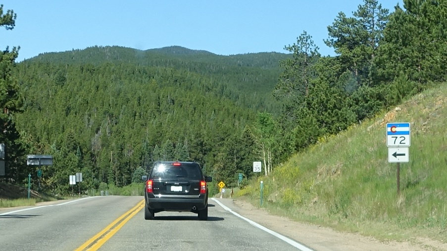 Before we know it, SH-72 splits without any advance signage. Turn left to head down off the Front Range.
