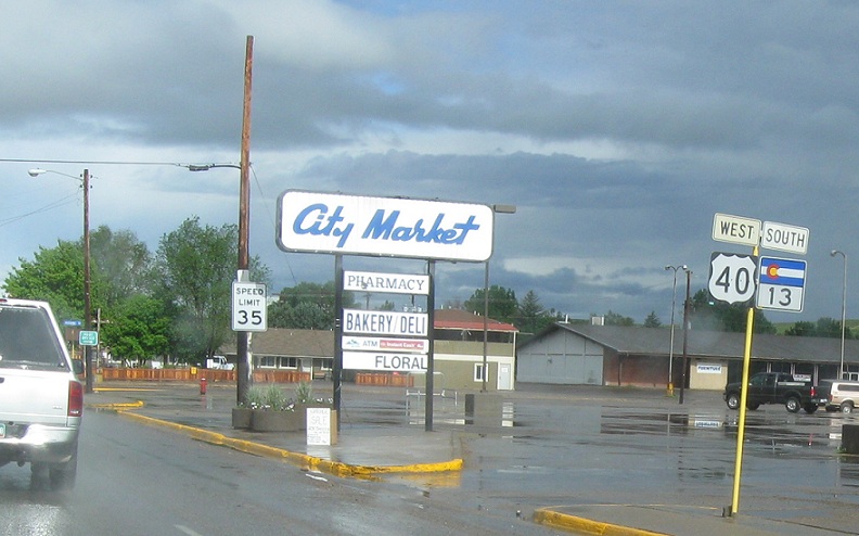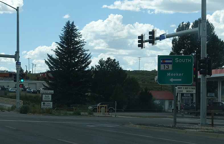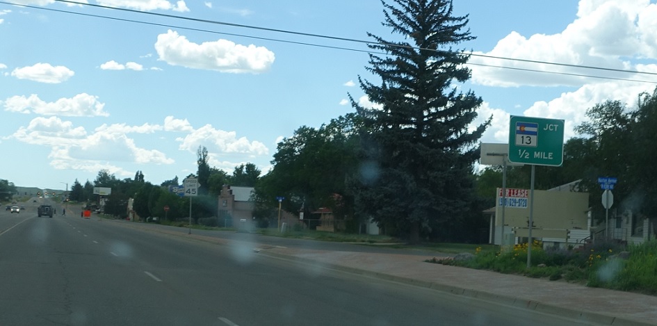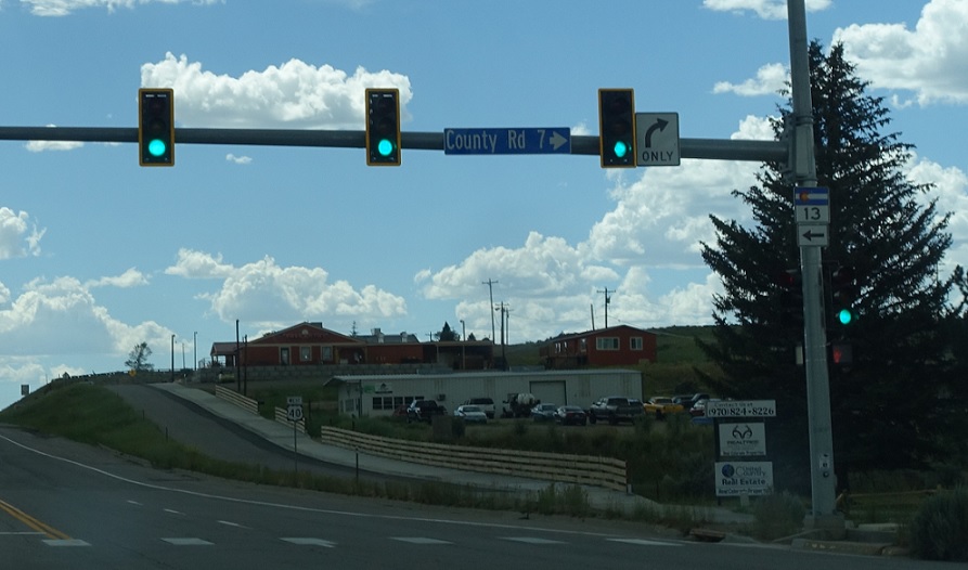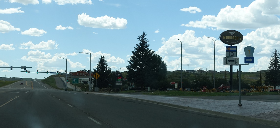 They reconfigured some of this signage as we approach the 13 split, but reused the old CR pentagon. Turn right for CR 7 and left for SH-13 at the light.