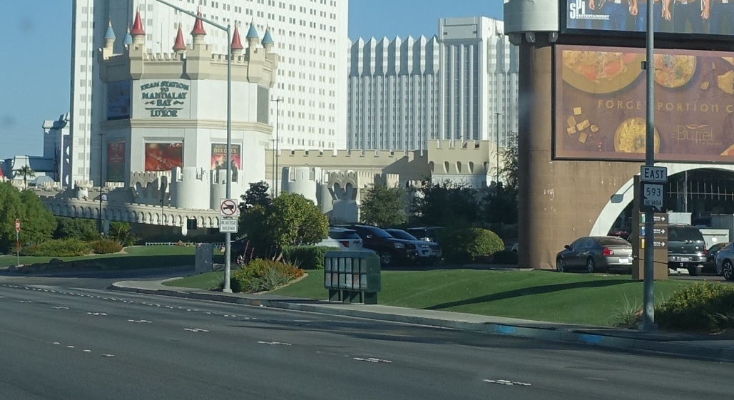 SR 593 ends here at Las Vegas Blvd, which features all-elevated pedestrian crossings. Las Vegas Blvd used to be SR 604, and before that was US 91. SR 593 will resume on Tropicana in a couple miles.