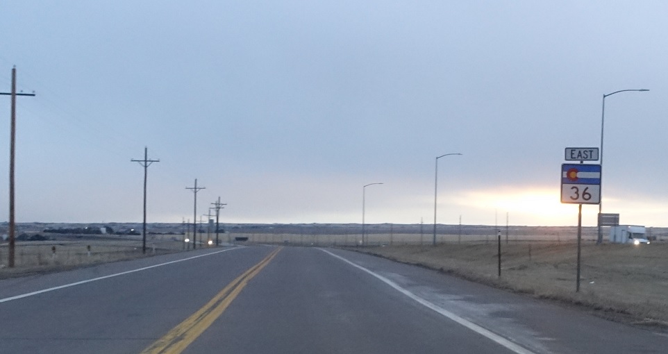 Reassurance shield as SH-36 begins. 36 follows the old routing of US-36/US-40/US-287 to Byers, and keeps the Colfax Avenue name through Adams County.