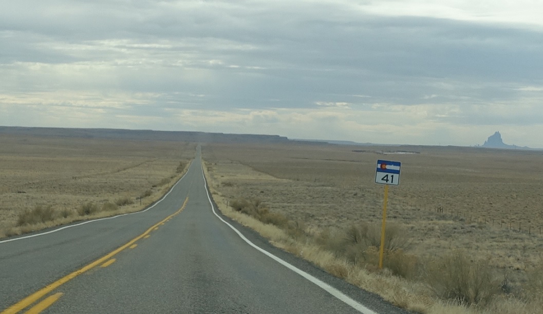 Reassurance shield a few miles later. SH-41 generally heads downhill and offers great views of Shiprock in New Mexico.