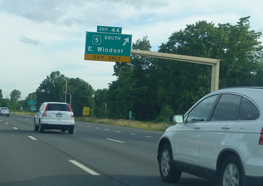Just after CT 140, exit for US 5 south as I-91 bends west to cross the Connecticut River.