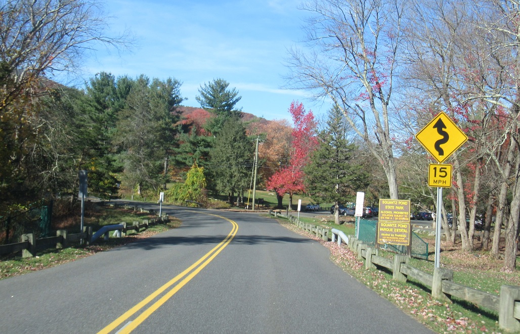 No signage as SSR 481 begins at the entrance to Squantz Pond State Park.