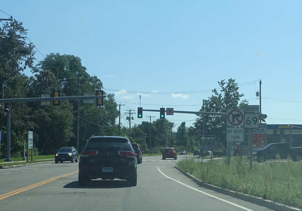 A quarter mile later, we’ll come to an unmarked junction with CT 63. CT 69 ends. Keep left for 63 south and make a hard right onto CT 63 north.