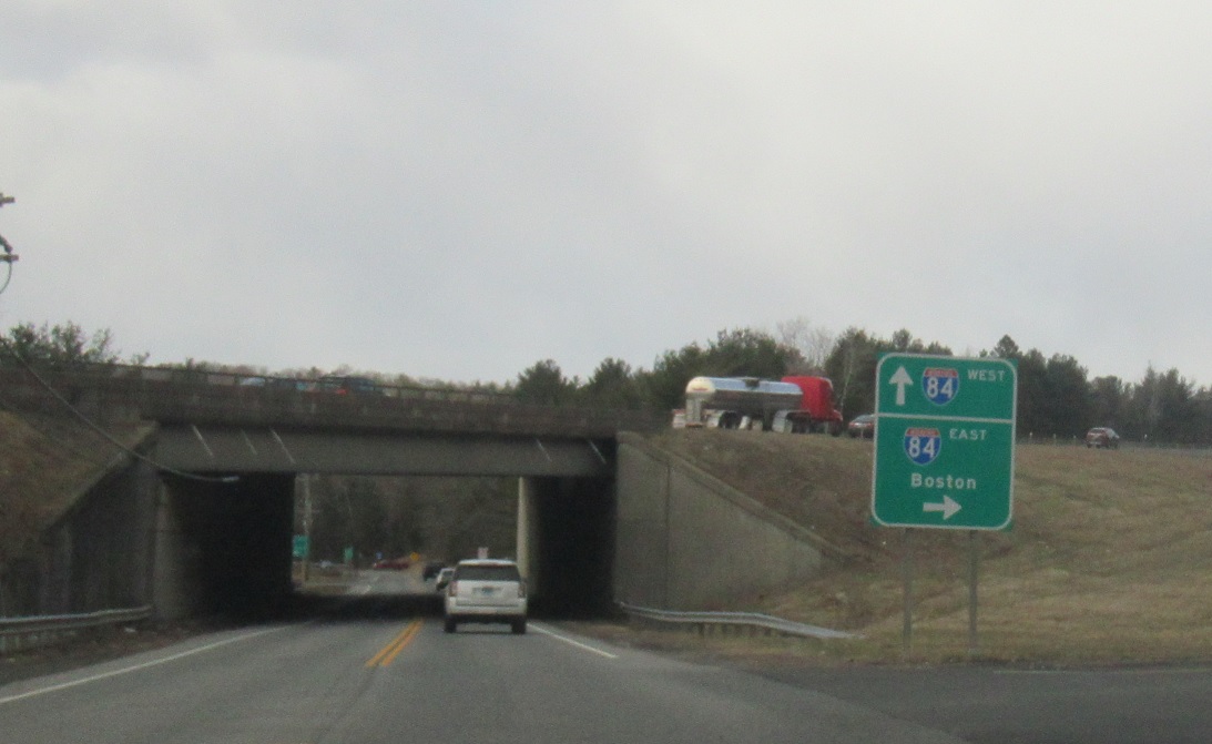 A couple miles later, we’ll approach I-84 without advance notice. Turn right for I-84 east to Boston.