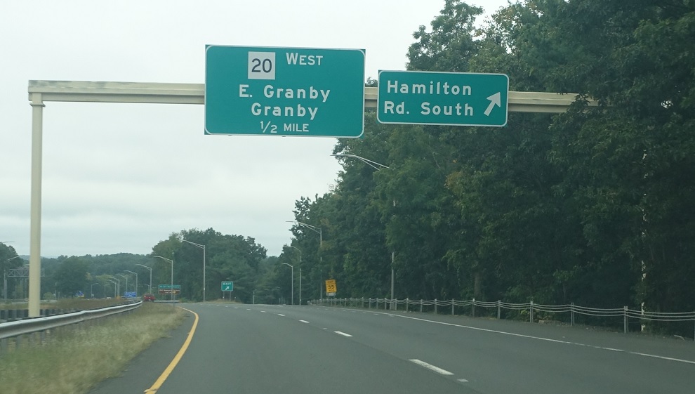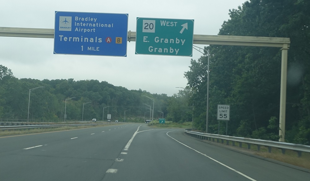 Exit for CT 20, which continues as a surface road to the Granbys. SSR 401 carries the freeway most of the way to BDL.