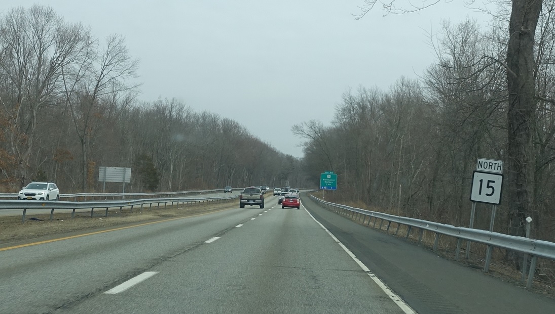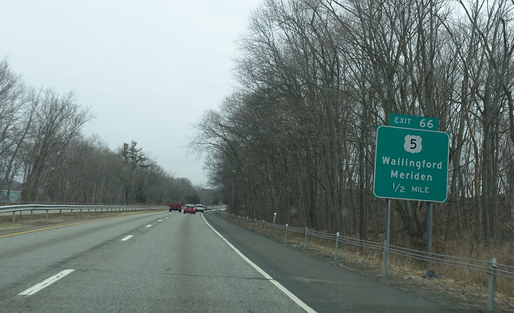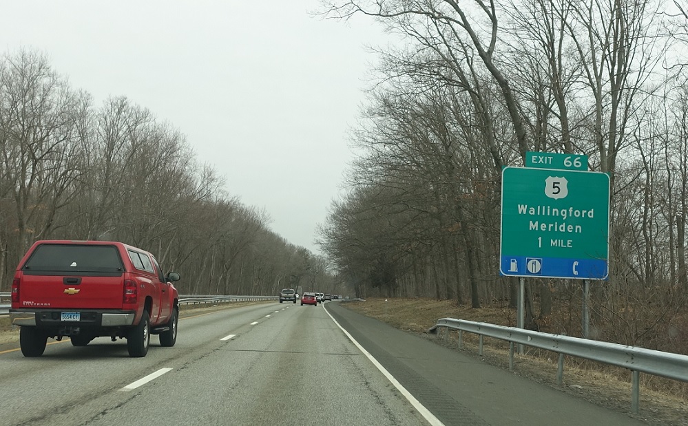 Exit in a half mile for US 5, which heads north to Meriden and south to Wallingford. CT 15 will actually concur with US 5 for most of the remainder of its distance – but not yet – first it is going to dip over to I-91.