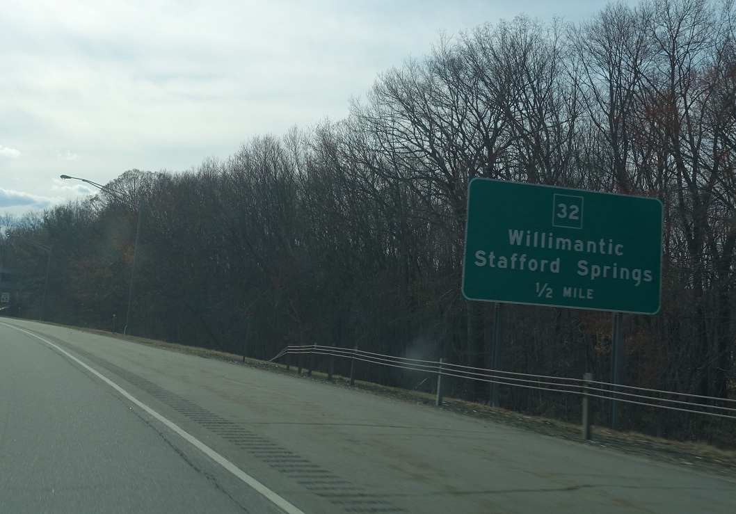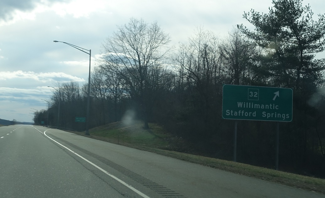 Exit for CT 32, which heads north to Stafford Springs and south into downtown Willimantic.