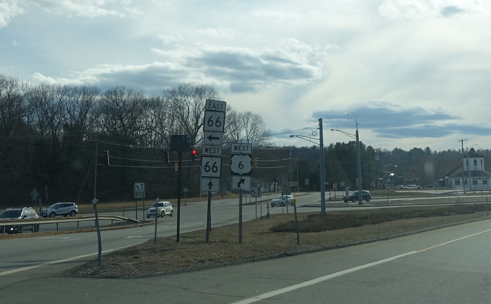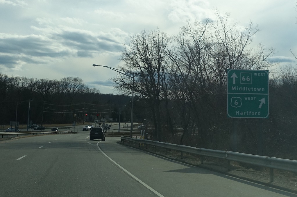 As we enter Columbia, the US 6 freeway ends as we approach CT 66 again. Follow CT 66/old US 6A west to Middletown. Keep right to stay on US 6 towards Hartford.