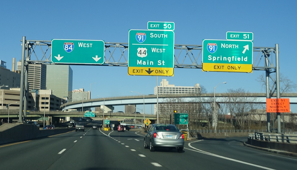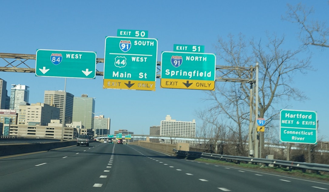 As we enter Hartford, exit right for I-91 north. Exit in the middle for US 44 west, which provides a connection to I-91 south via local streets. Keep left for I-84/US 6 west through Hartford.