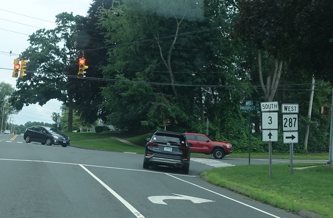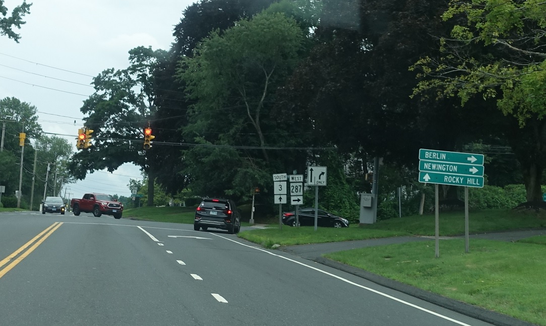 At the light, we’ll approach CT 287. Turn right for 287 west to Berlin and Newington. Stay on CT 3 south for Rocky Hill.