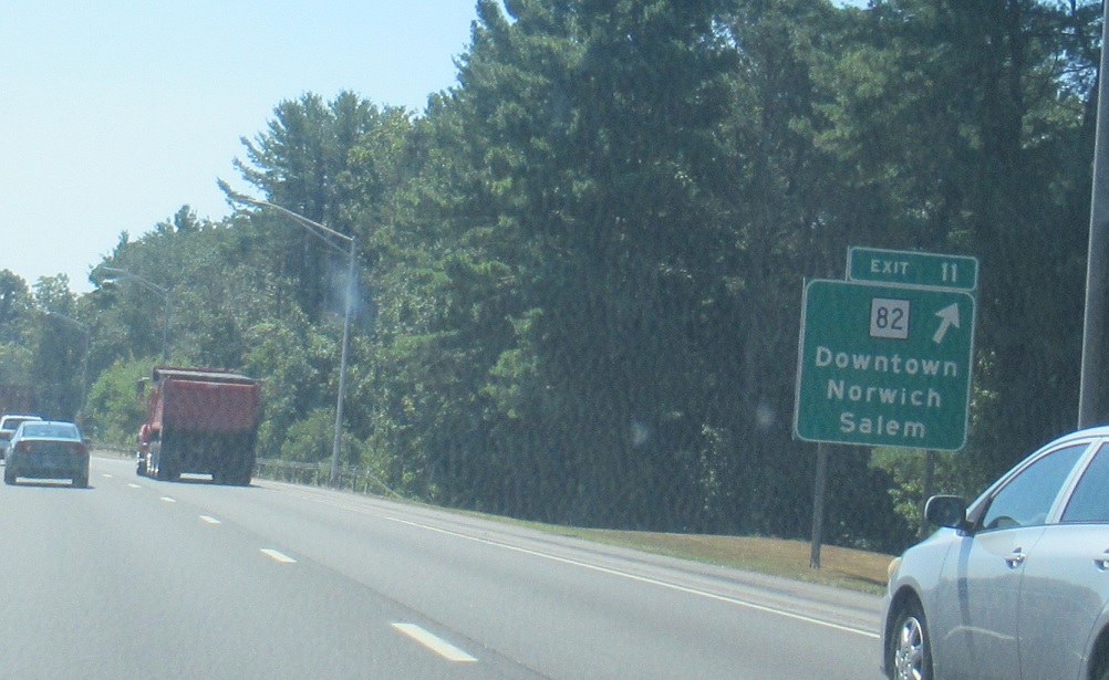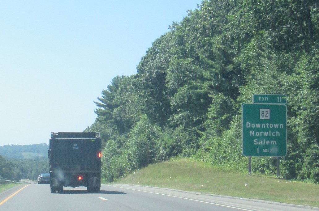 Exit for CT 82, which heads east back to downtown Norwich and back west towards Salem. CT 2A stays with I-395.