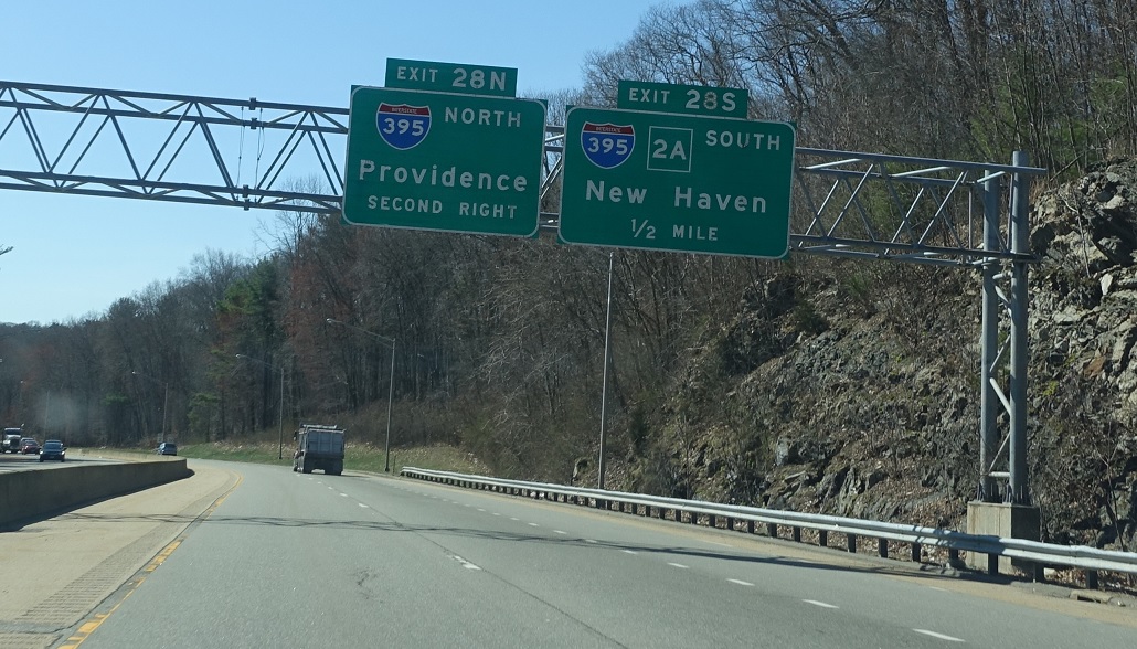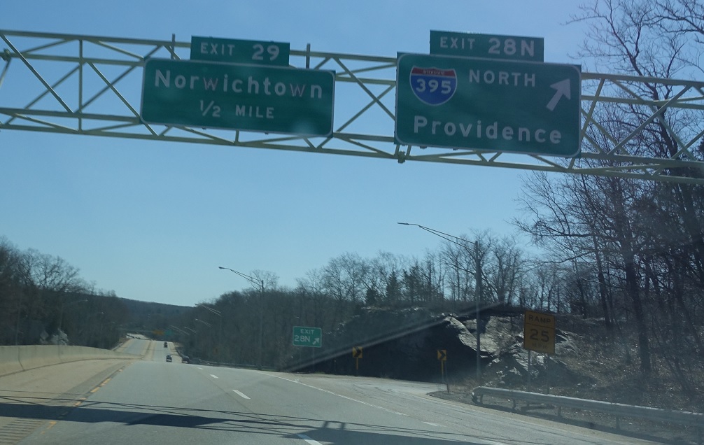 Exit for I-395 north towards Providence, R.I. via the Connecticut Turnpike. In a half mile, we’ll approach SR 914 at the Norwichtown interchange.