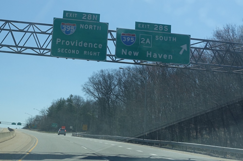 In a half mile, exit for I-395 south and CT 2A east towards New Haven. CT 2A is a Norwich bypass and connection to the Mohegan Sun Casino.