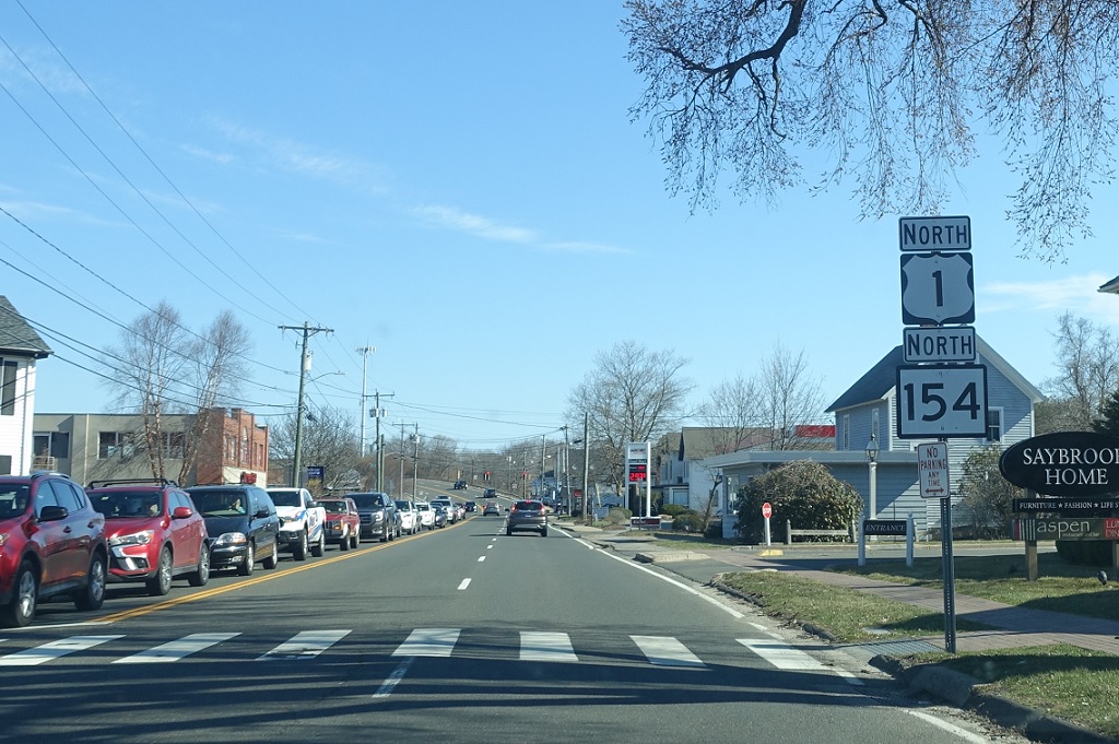 As we head out of downtown Old Saybrook, turn right ahead for US 1 north to I-95 north. Keep left for CT 154 north to I-95 south.