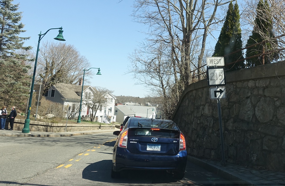 As we descend to shorefront downtown Mystic, turn right ahead for 215 back west to Noank.