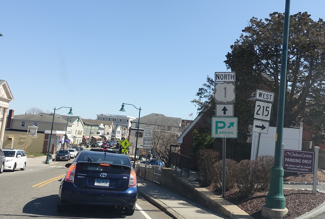 Just after SR 614, keep left for US 1 and Main St while New London Rd connects to CT 215. US 1 has the drawbridge.