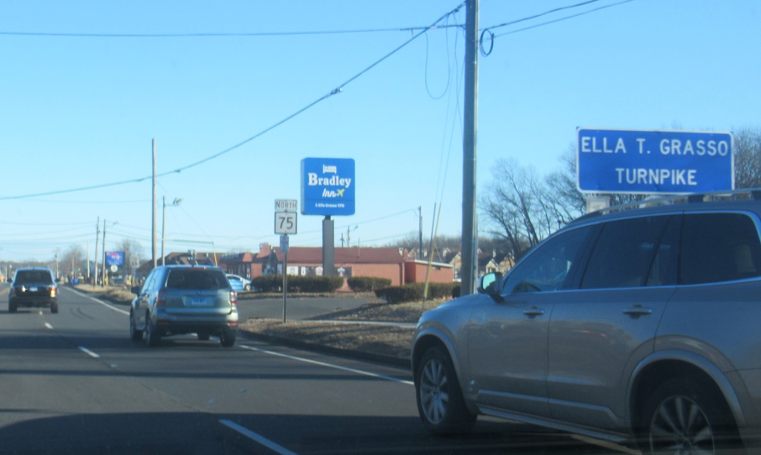 As we enter Windsor Locks, CT 75 becomes the Ella T Grasso Turnpike, after the first woman governor of Connecticut and of any state in the USA.