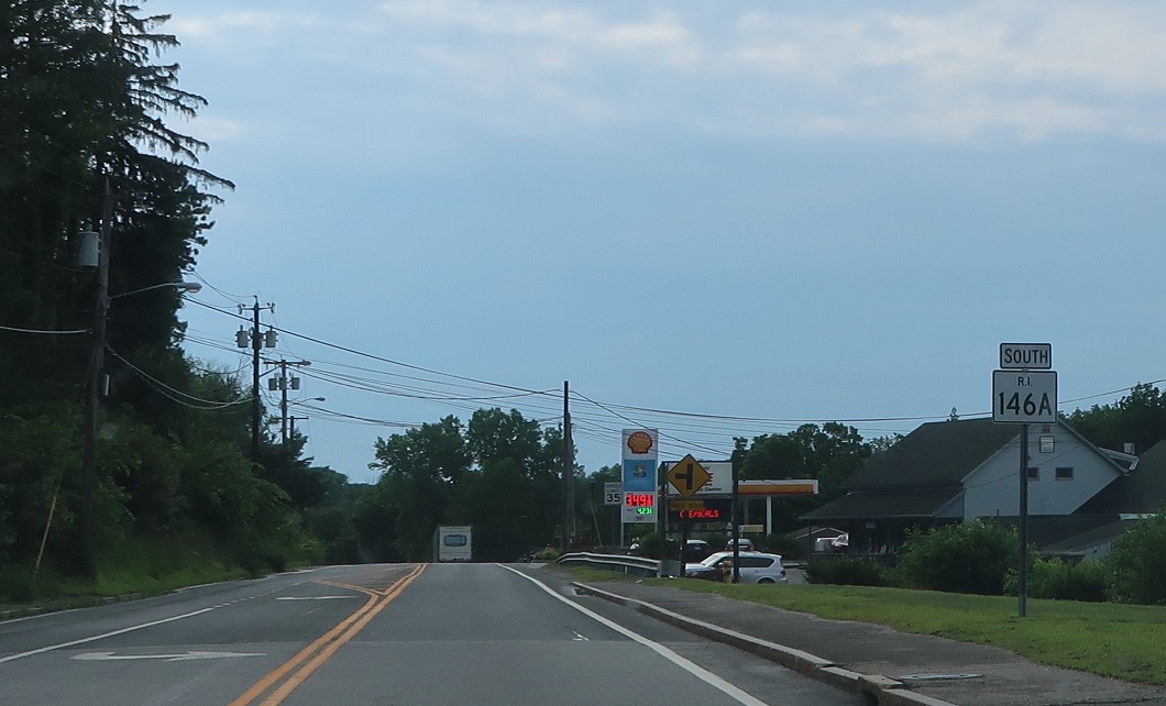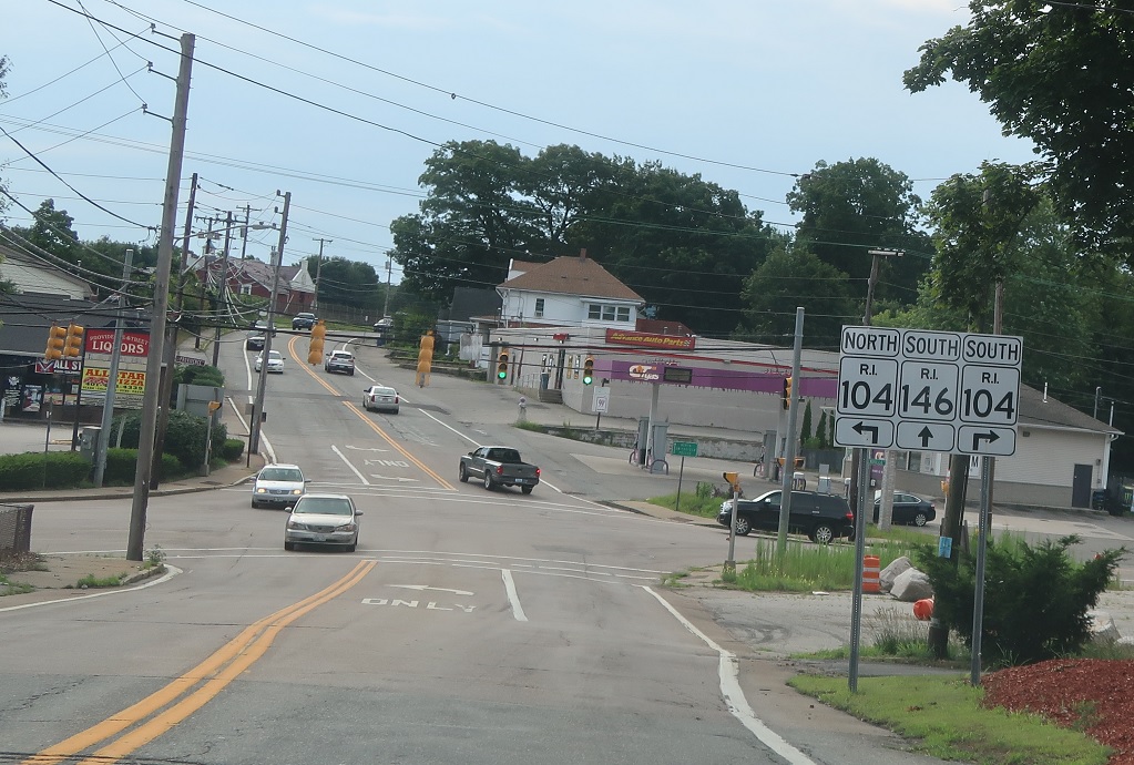 RI 146A will parallel the Woonsocket town line, with Woonsocket on the left and North Smithfield on the right. As we do this, we’ll approach RI 104. Turn right for 104 south and left for 104 north. Stay straight to connect to 146 south via 146A.