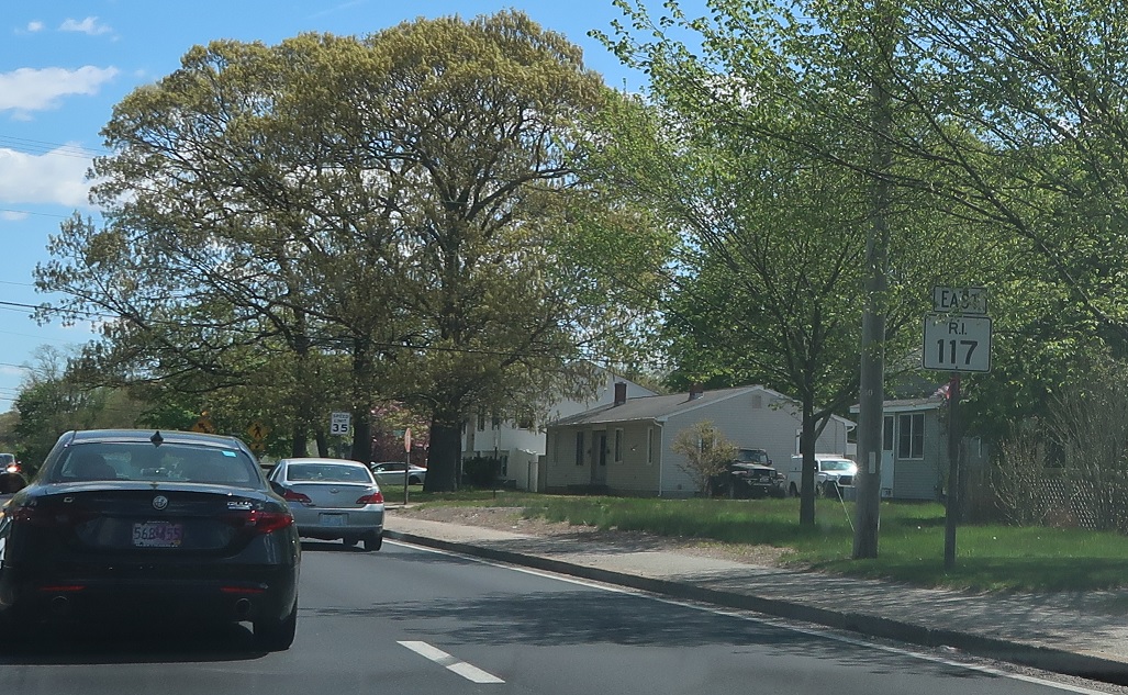 Several blocks later, we’ll come to a shieldless junction with RI 117A. Turn left for 117A north, which bypasses Shawomet to head straight north to the 117 junction near US 1A. Stay straight to stay on 117 east.