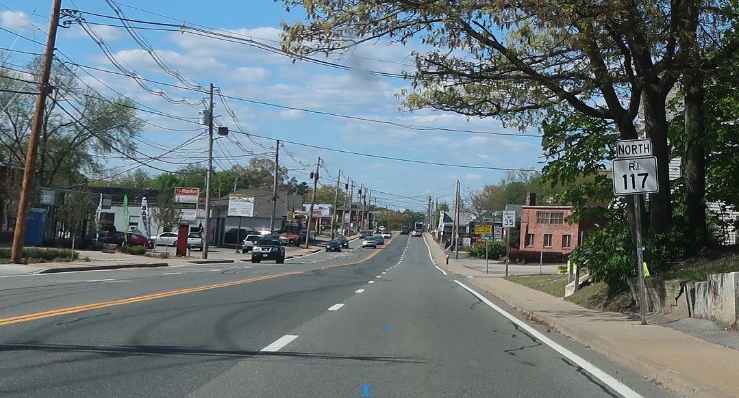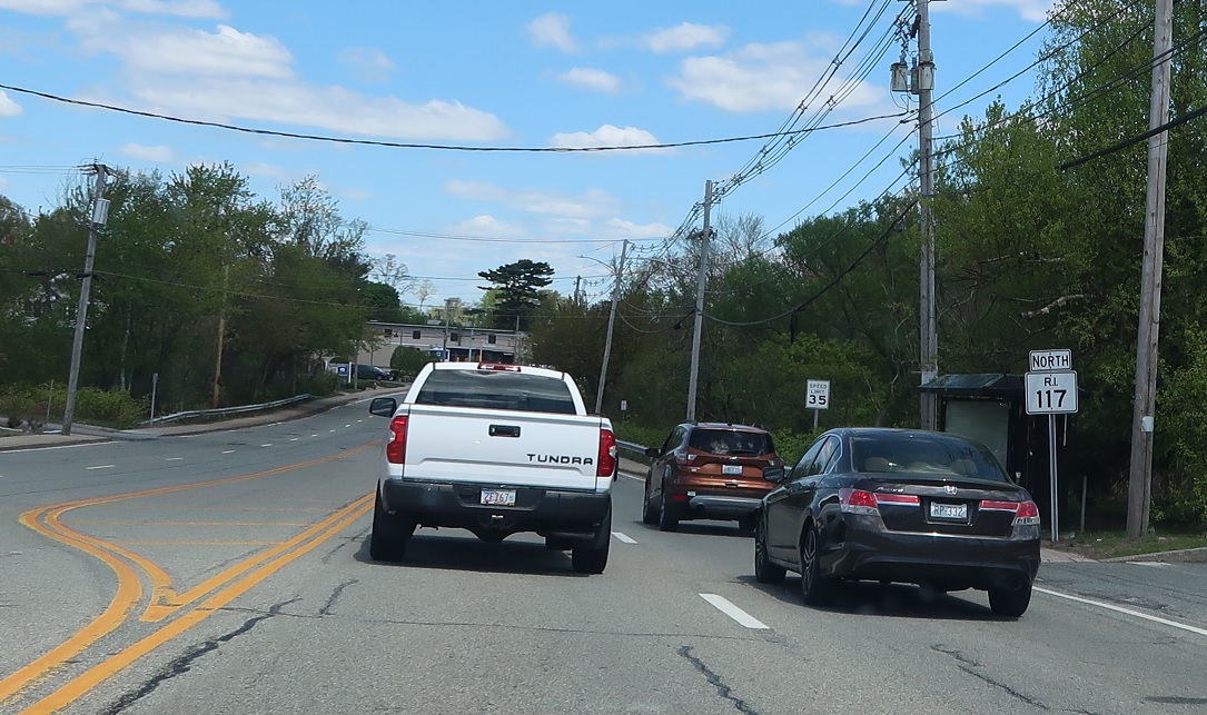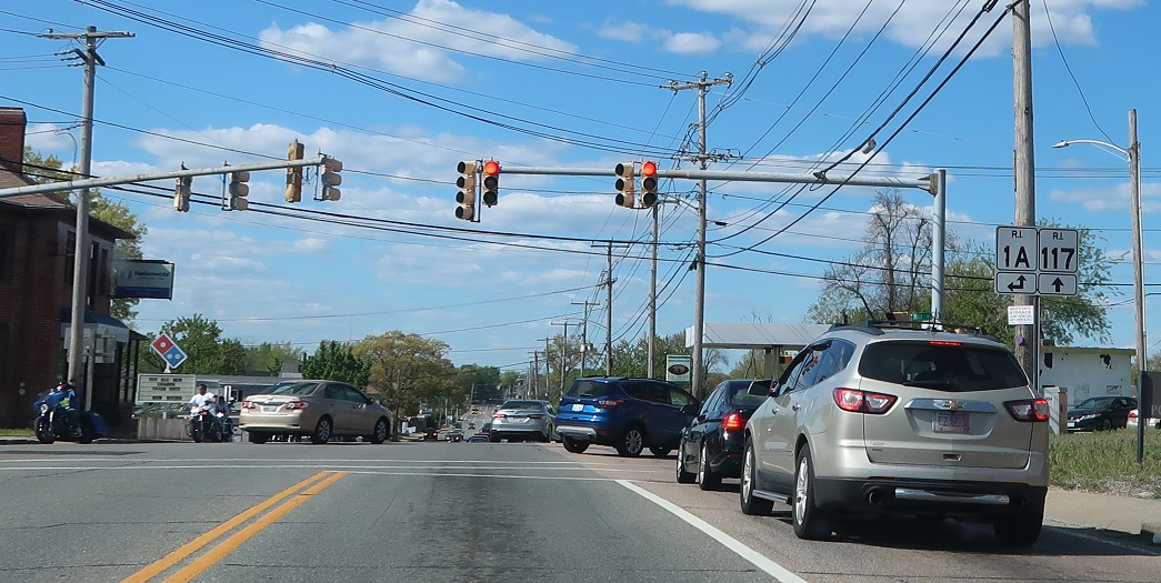 A few blocks later, we’ll approach US-1A, which is usually signed as RI 1A. Stay straight for 1A/117 north, which have a useless concurrency. Turn left for 1A south.