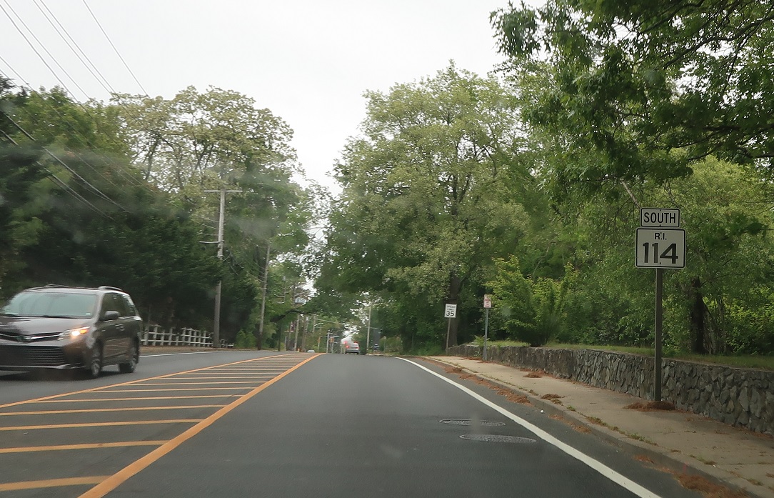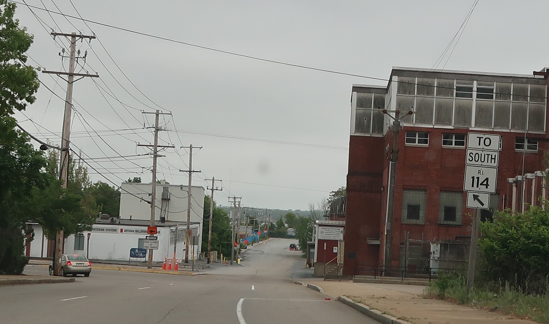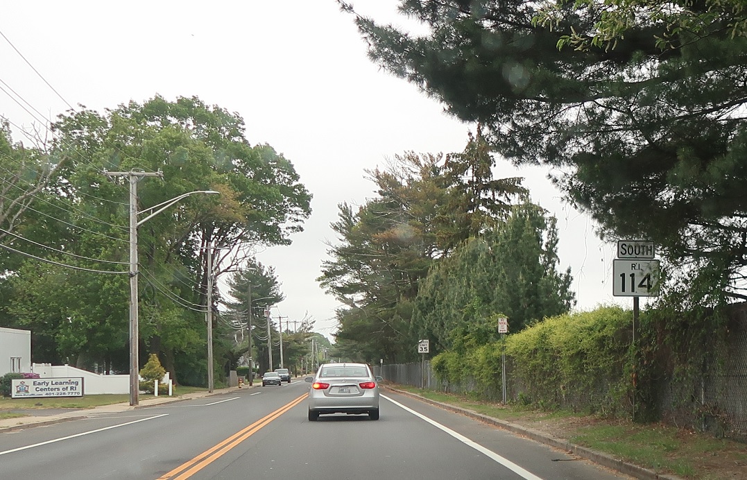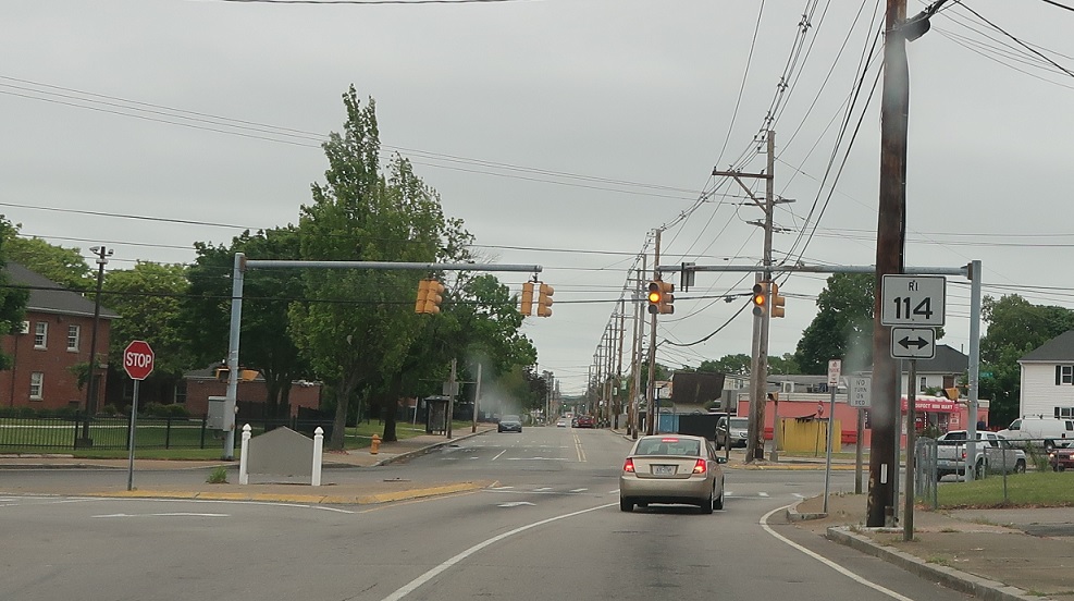 Turn right to stay on RI 114 south. RI 114 north traffic turns left here to head the other way up the one-way couplet.