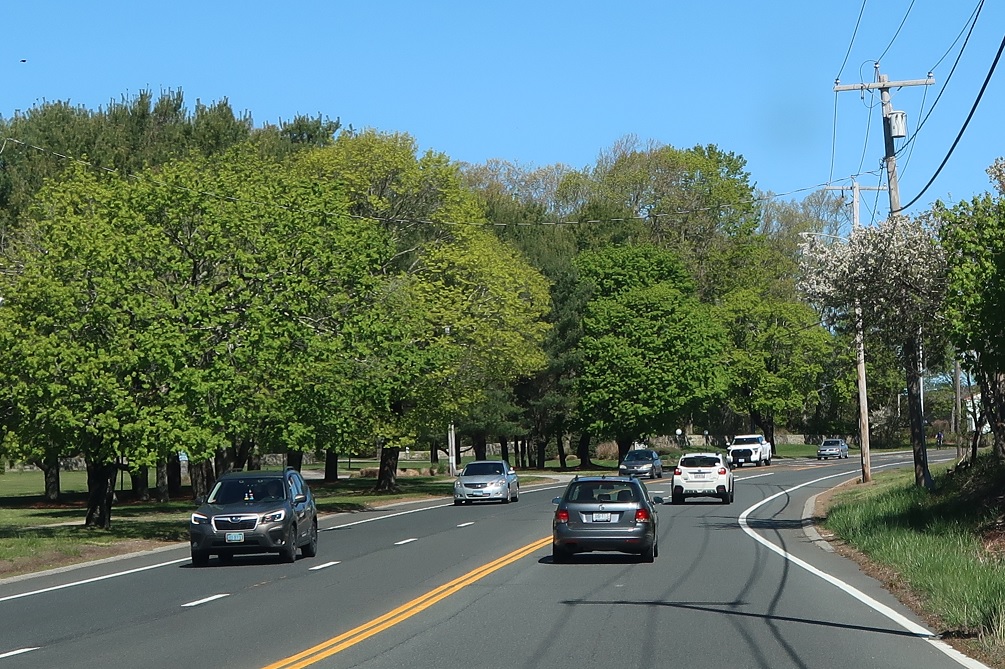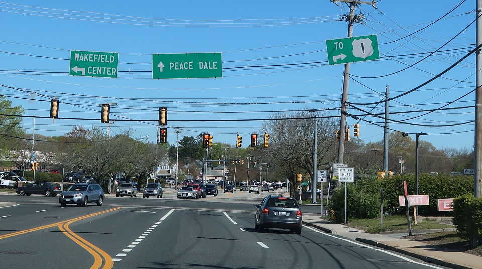 A few blocks later, 1A and 108 will split. Turn left for 1A south into Wakefield Center. Follow 108 north to Peace Dale. Turn right for a local road back to US 1.