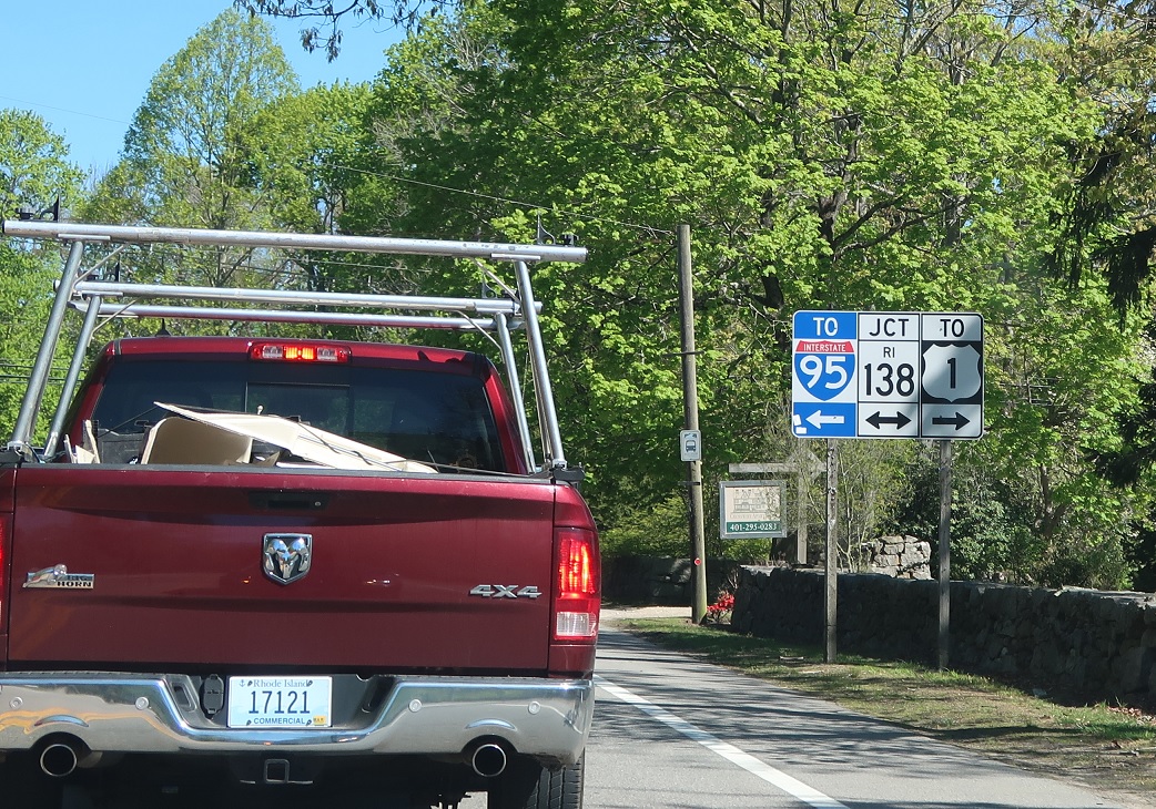 A mile or so later, we’ll approach RI 138. Turn right for 138 east to US 1. Turn left for 138 west to I-95. RI 108 ends.