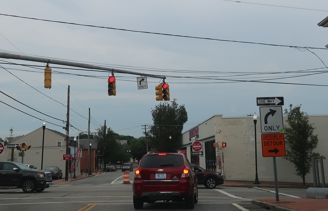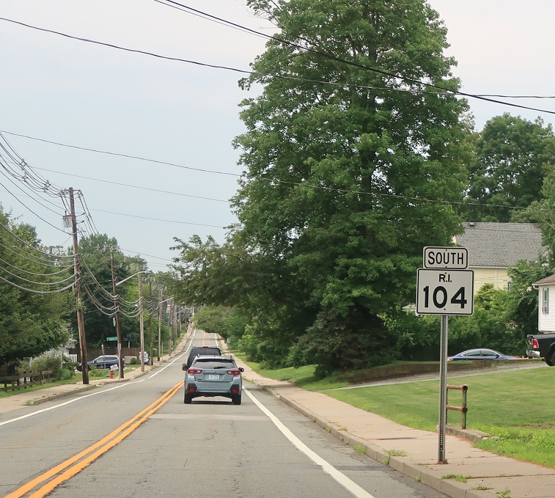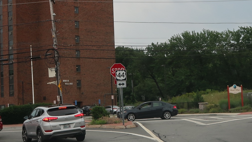 Several blocks later, we’ll approach US 44. Turn right for US 44 west, which loops back around to US 44 east. RI 104 north traffic approaches from ahead via a turn from US 44 east.