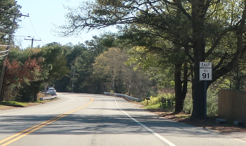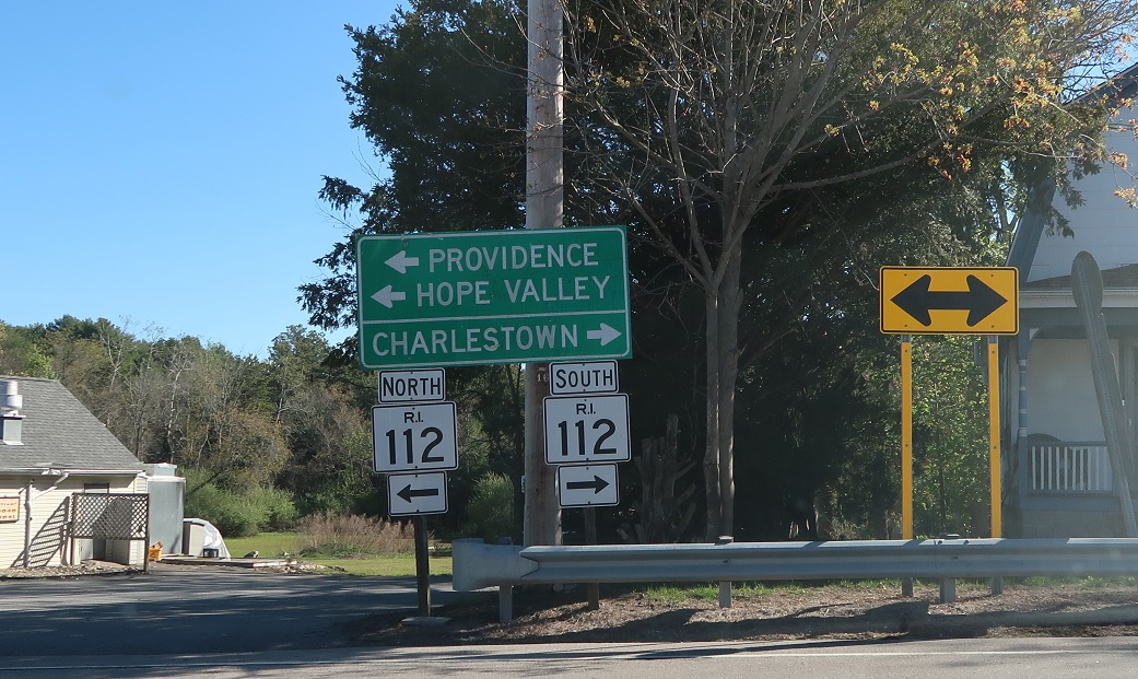 Shortly thereafter, we’ll enter Charlestown and approach RI 112. Turn right for 112 south to Charlestown center and left for 112 north to Providence and Hope Valley. RI 91 ends.
