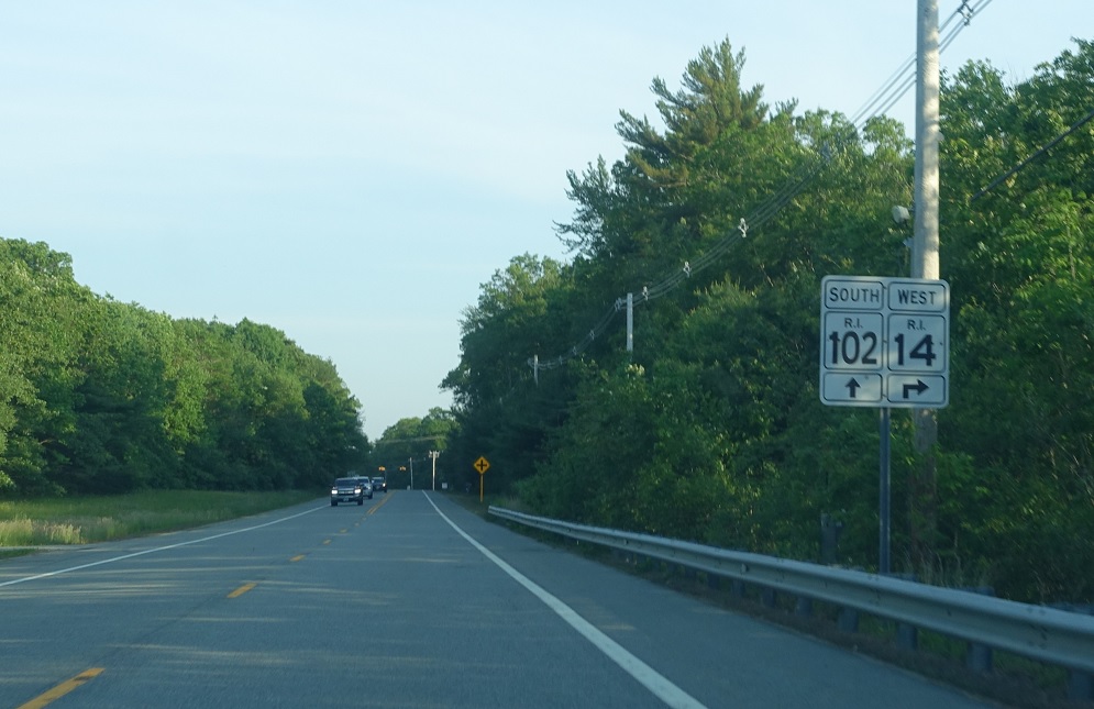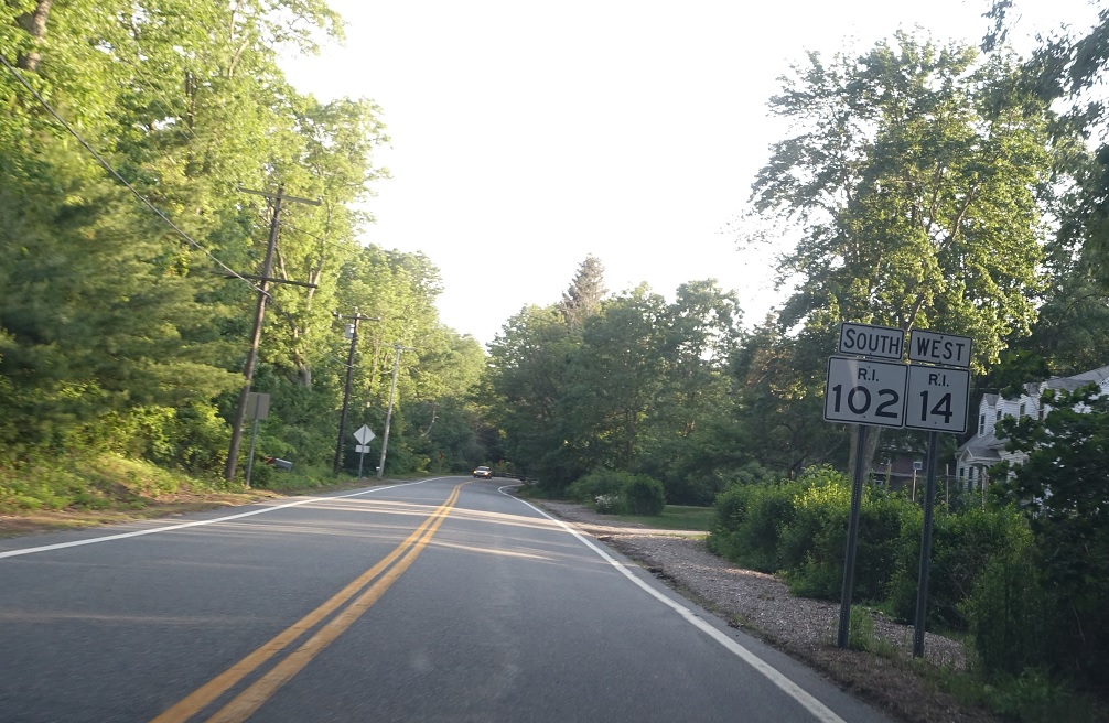 A couple miles later, RI 14 will turn right to continue west to Connecticut. Stay straight to stay on RI 102 south.