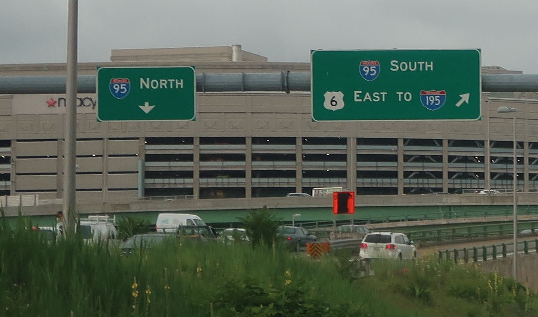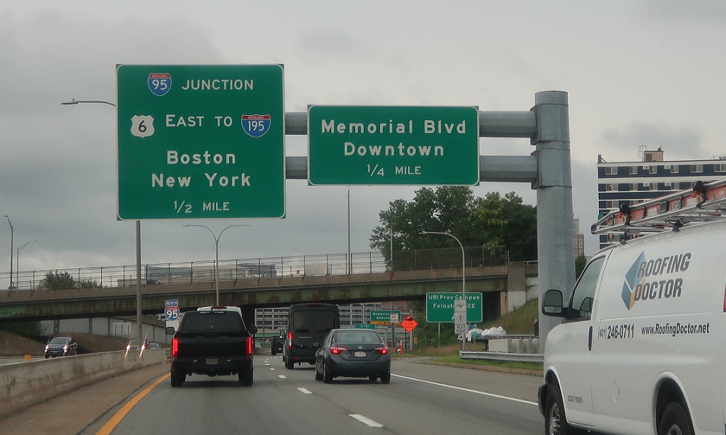 Exit in a half mile for the ramps to I-95 in both directions and US 6 east, which heads to I-195. Keep right to connect to US 1.