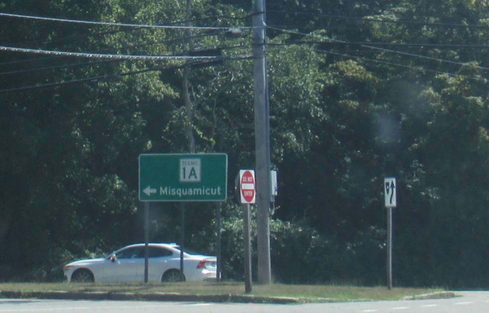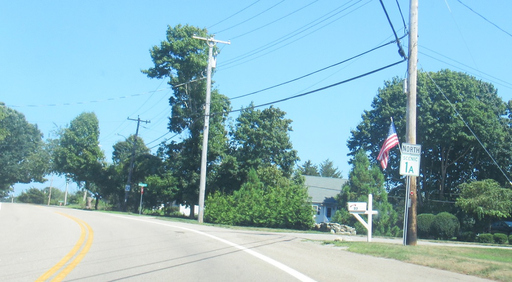 RI 1A begins on the south side of Westerly at the intersection of Beach and Elm. There’s no clear indication that it actually goes north from here and reconnects to U.S. 1, though varying maps route it up Main and up Elm. RI 1A is typically signed as “Scenic” 1A.