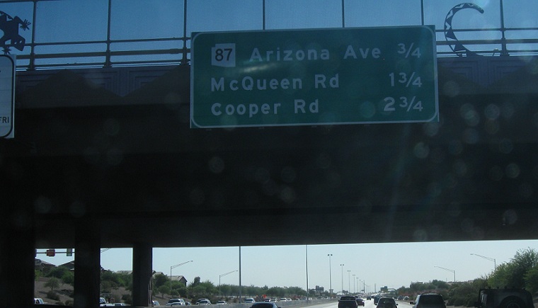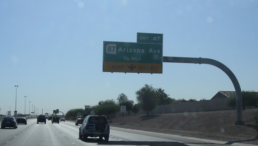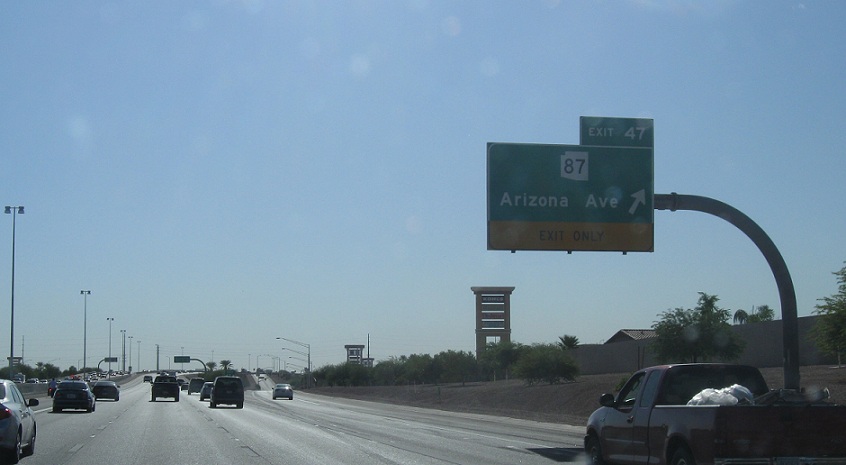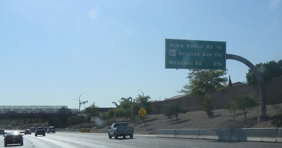 Exit for Old SR 87. 87 used to follow Arizona Ave through Chandler and Mesa, but a lot of it has been turned to local control. This area is one of those areas. Heading south, 87 resumes about a mile south of here. Heading north, 87 resumes briefly for the US-60 junction, then terminates again until the northern 202 junction