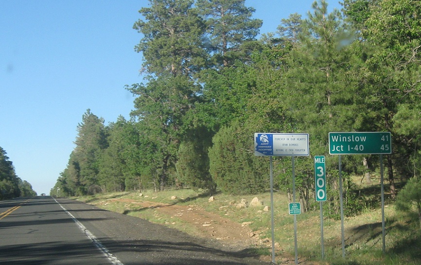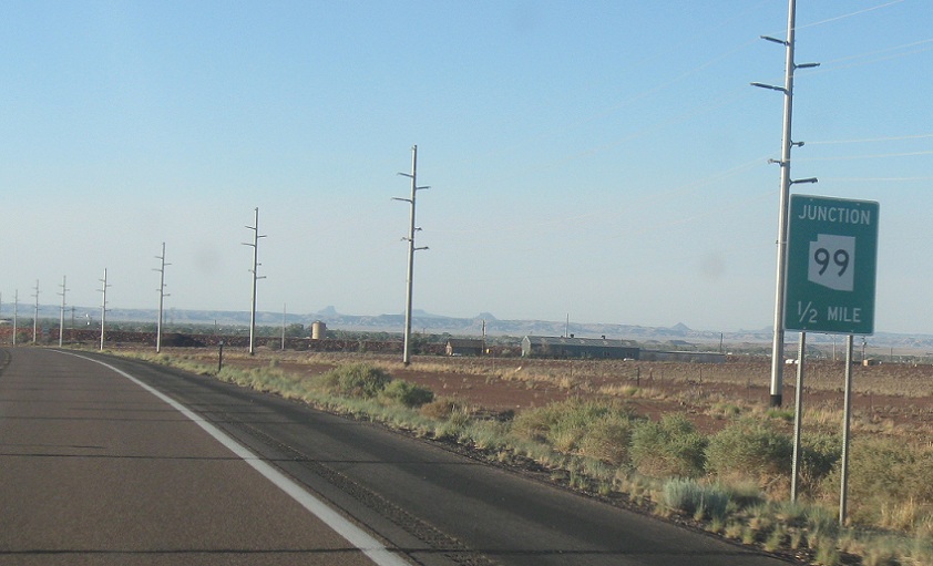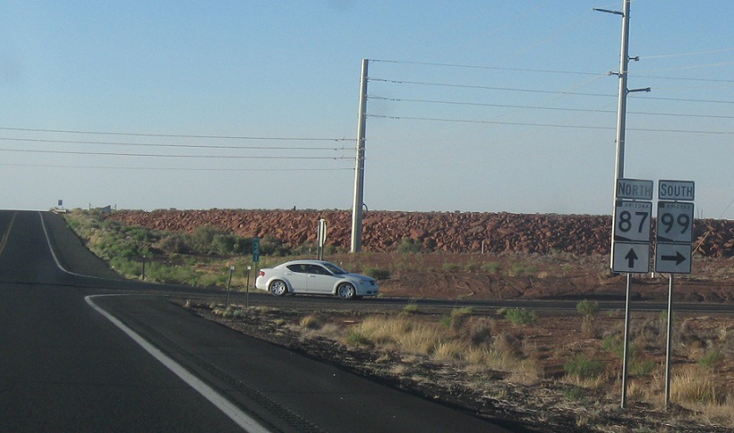 Turn right for 99 south. Stay straight for 87 north and 99 north, which is sporadically signed and follows a very disjointed path. 99 heads northwest from here onto I-40 and then spurs to Leupp. Turning right here heads down to the forest boundary and ends. It’s one of the weirder highways in Arizona for sure.