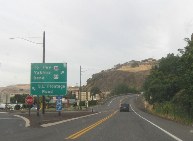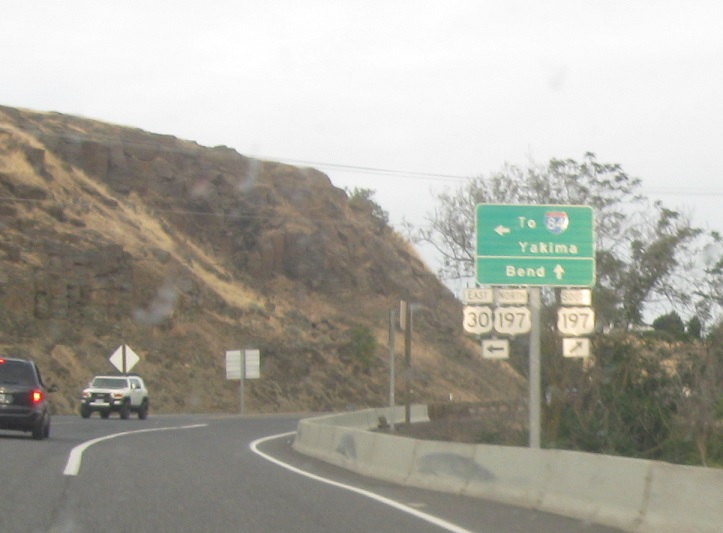 Turn left for 30 east and 197 north towards Yakima and I-84. Keep right for 197 south to Bend.